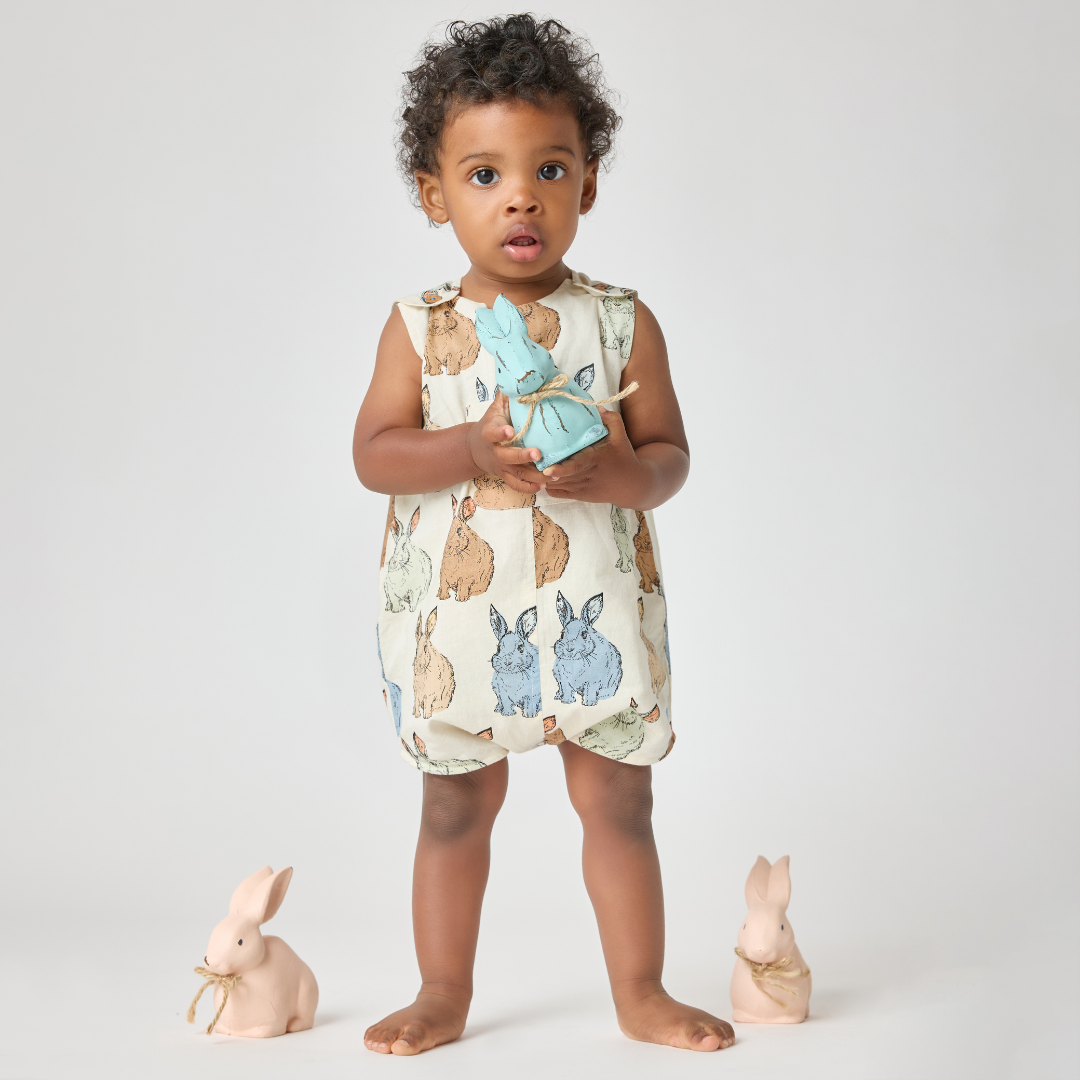 A springtime favorite with classic bunny charm! The Baby Boys Noah Jumper features a sweet blue vintage bunny print in soft 100% cotton. Designed with wood buttons at the shoulder for easy dressing and finished with a playful front pocket at the center chest, this timeless one piece is perfect for everyday wear and first Easter celebrations.